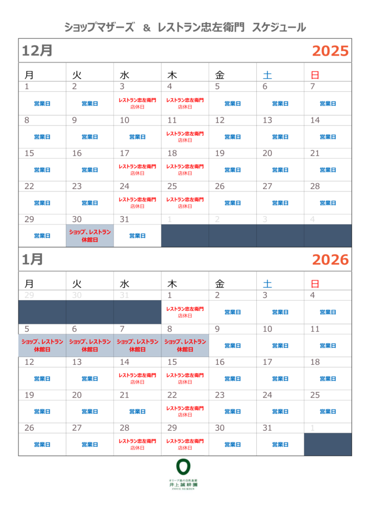 2025年12月と2026年1月の営業日カレンダーです。1月からは休館日もいただきます。